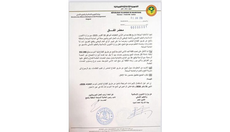 أعلنت وزارة الشؤون الإسلامية والتعليم الأصلي، بالتعاون مع الاتحاد الوطني لأرباب العمل الموريتانيين – اتحادية السياحة، تفاصيل تنظيم الحج عبر القطاع الخاص لموسم 1447هـ/2026م.