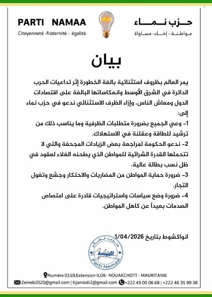 يمر العالم بظروف استثنائية بالغة الخطورة إثر تداعيات الحرب الدائرة في الشرق الأوسط وانعكاساتها البالغة على اقتصادات الدول ومعاش الناس، وإزاء الظرف الاستثنائي ندعو في حزب نماء إلى: