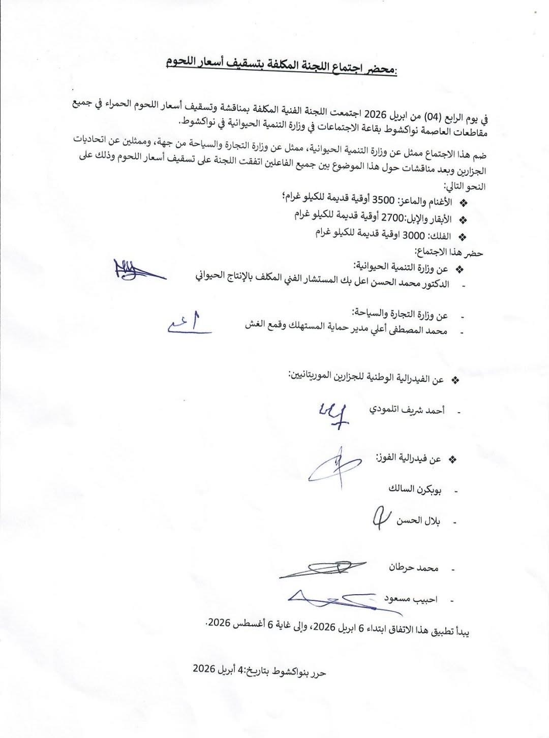 أعلن زوال اليوم السبت، في مباني وزارة التنمية الحيوانية بالعاصمة نواكشوط، عن اعتماد تسقيف لأسعار اللحوم الحمراء، سيبدأ العمل به الإثنين 6 إبريل الجاري، ويعتمد مبلغ 3500 أوقية قديمة كسعر ثابت لكيلوغرام لحم الضأن وللماعز