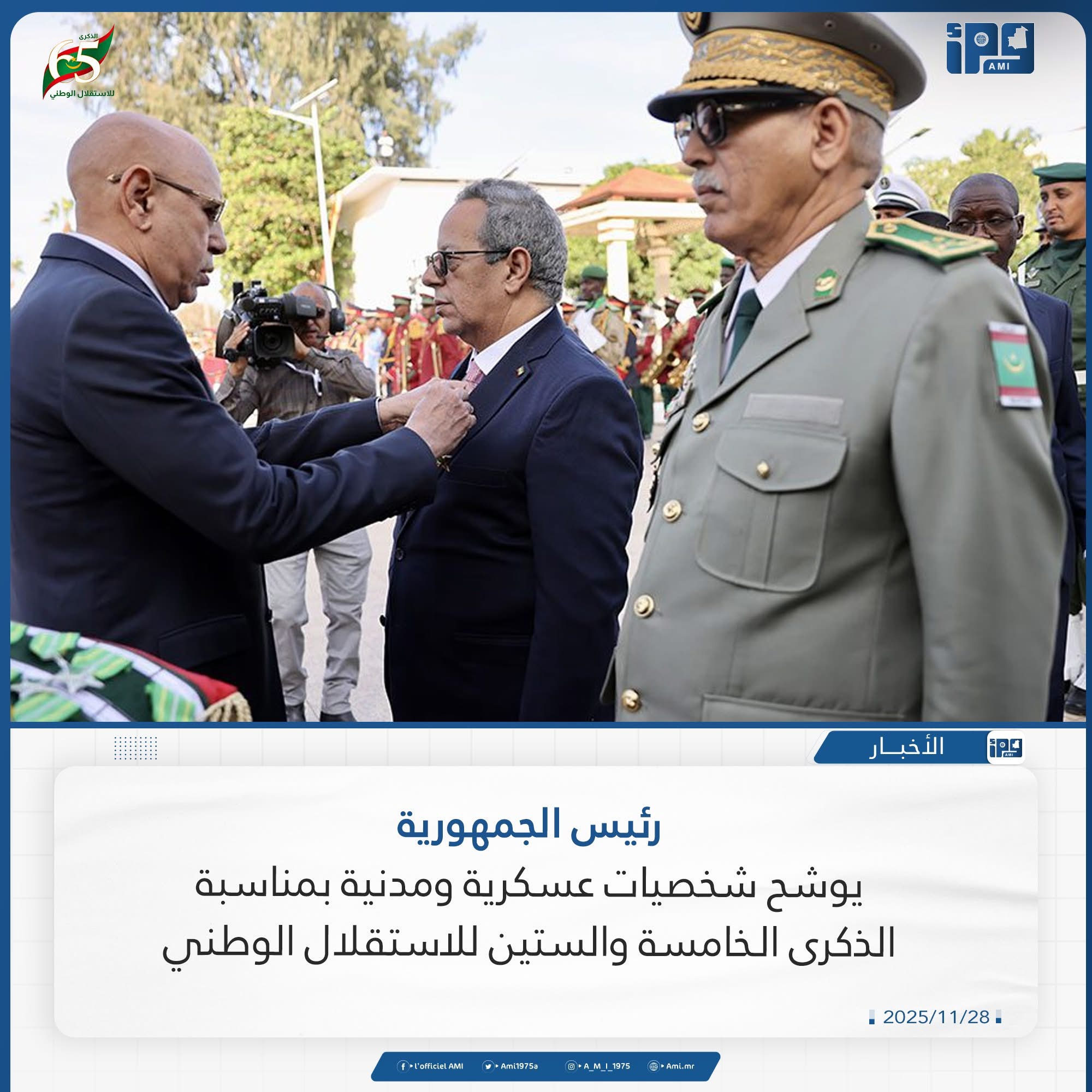 وشح رئيس الجمهورية، السيد محمد ولد الشيخ الغزواني، صباح اليوم الجمعة بالقصر الرئاسي في نواكشوط، شخصيات عسكرية ومدنية، بمناسبة الذكرى الخامسة والستين للاستقلال الوطني، وهكذا تم توشيح: