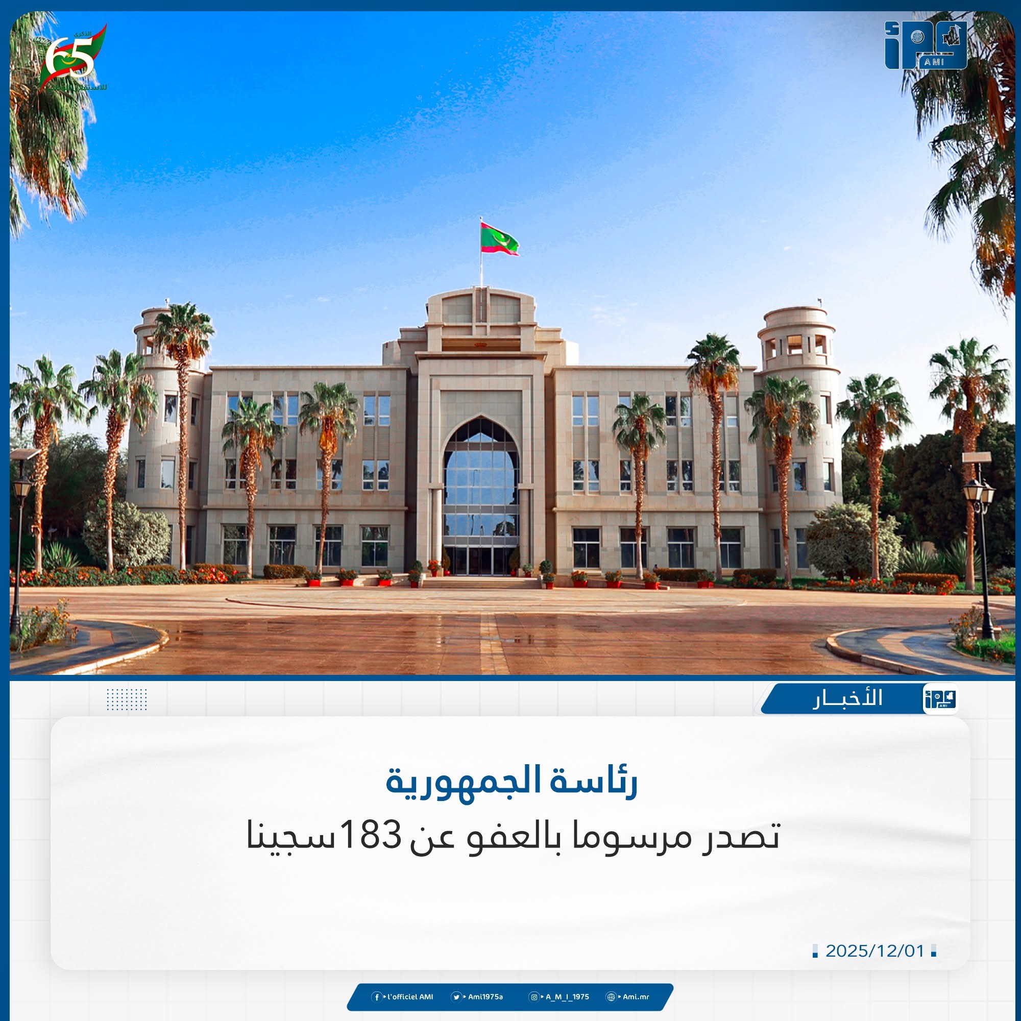 أعلنت رئاسة الجمهورية أنه بمناسبة الذكرى الخامسة والستين لعيد الاستقلال المجيد، وبناء على مقتضيات المادة 37 من الدستور، أصدر فخامة رئيس الجمهورية السيد محمد ولد الشيخ الغزواني، مرسوما بتخفيض مدة سنة (1) نافذة من العقوبة