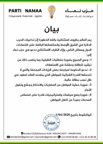 يمر العالم بظروف استثنائية بالغة الخطورة إثر تداعيات الحرب الدائرة في الشرق الأوسط وانعكاساتها البالغة على اقتصادات الدول ومعاش الناس، وإزاء الظرف الاستثنائي ندعو في حزب نماء إلى: